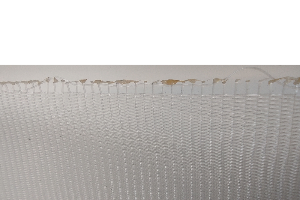 Siatka cięta jest nożem termicznym wzdłuż rolki aby zapobiec strzepieniu się. Zdjęcie prezentuje zbliżenie ciętej strony.