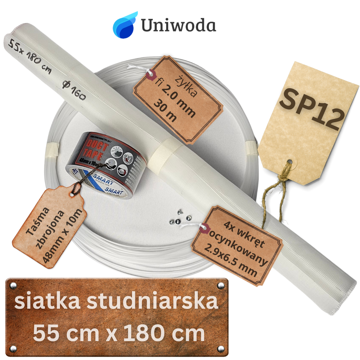 Zestaw siatka studniarska SP12 o wymiarach 55×180 cm + żyłka (o grubości 2,0 mm) 30 metrów GRATIS + taśma zbrojona (48mmx10m) + 4 wkręty mocujące !