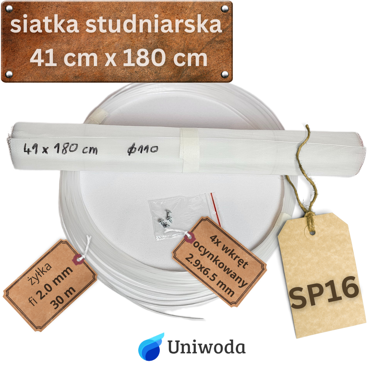 Zestaw siatka studniarska SP16 o wymiarach 41×180 cm + żyłka (o grubości 2,0 mm) 30 metrów GRATIS + taśma zbrojona (48mmx10m) + 4 wkręty mocujące !